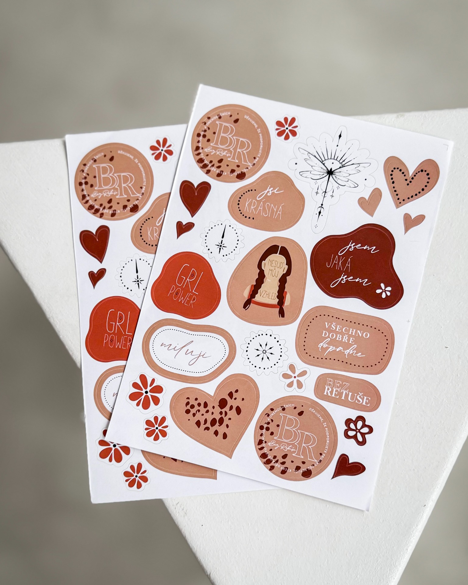 Papírové samolepky na A5 archu s tématickými obrázky nebo motty, které povzbudí tvé sebevědomí. Polep si svůj diář, notes nebo notebook, aby ti každý den připomínaly, jak výjimečná jsi.24 samolepek pro zlepšení tvého dne.